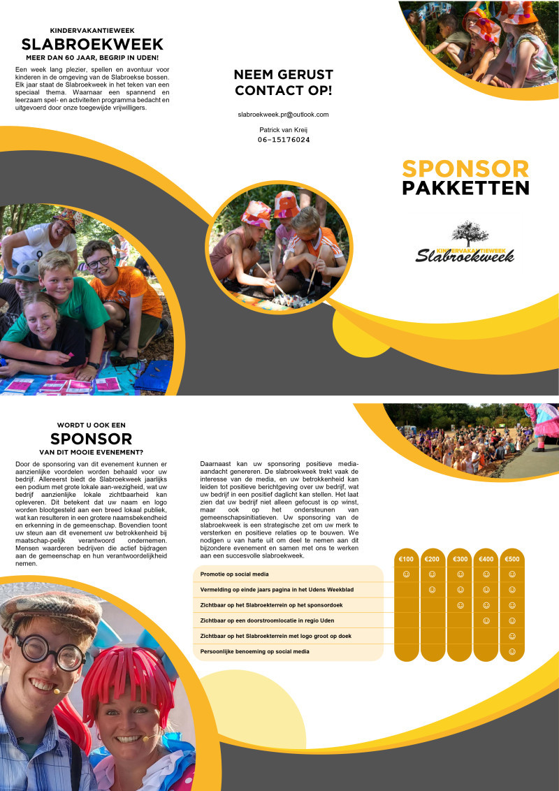 We nodigen je van harte uit om kennis te maken met de Slabroekweek en onze speciaal samengestelde sponsorpakketten. Dit bijzondere evenement biedt een unieke kans om samen iets moois neer te zetten.